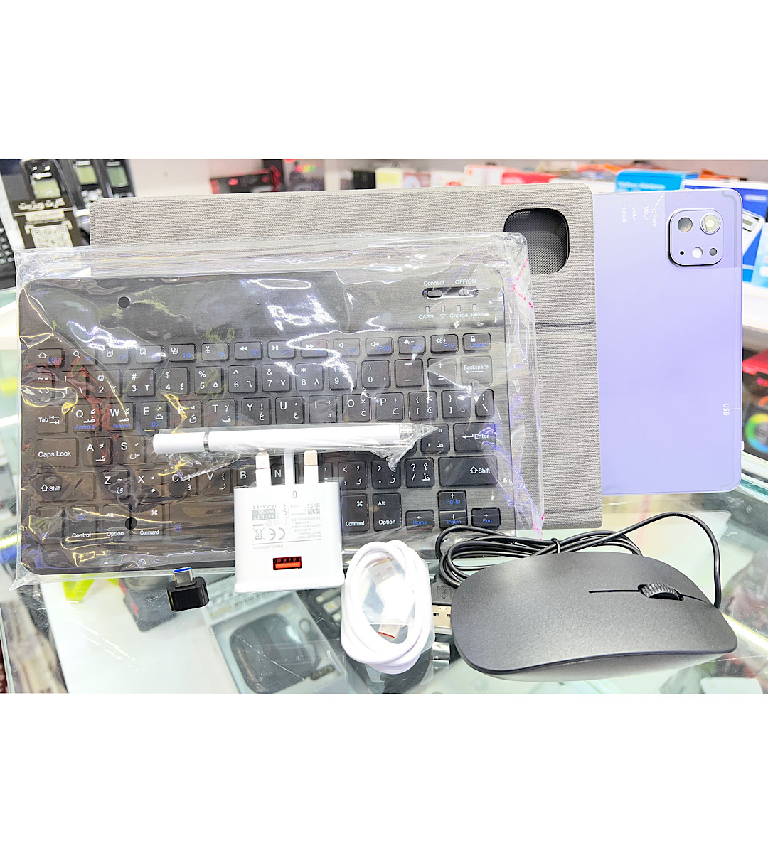 وهمچنین این تبلت دارای تمامی لوازم جانبی خودش ازجمله قاب محافظ،موس،کیبورد بیسیم،قلم لمسی،otjوشارژر خودش میباشد که دیگه نیازی به خرید لوازم جانبیش پیدا نمیکند