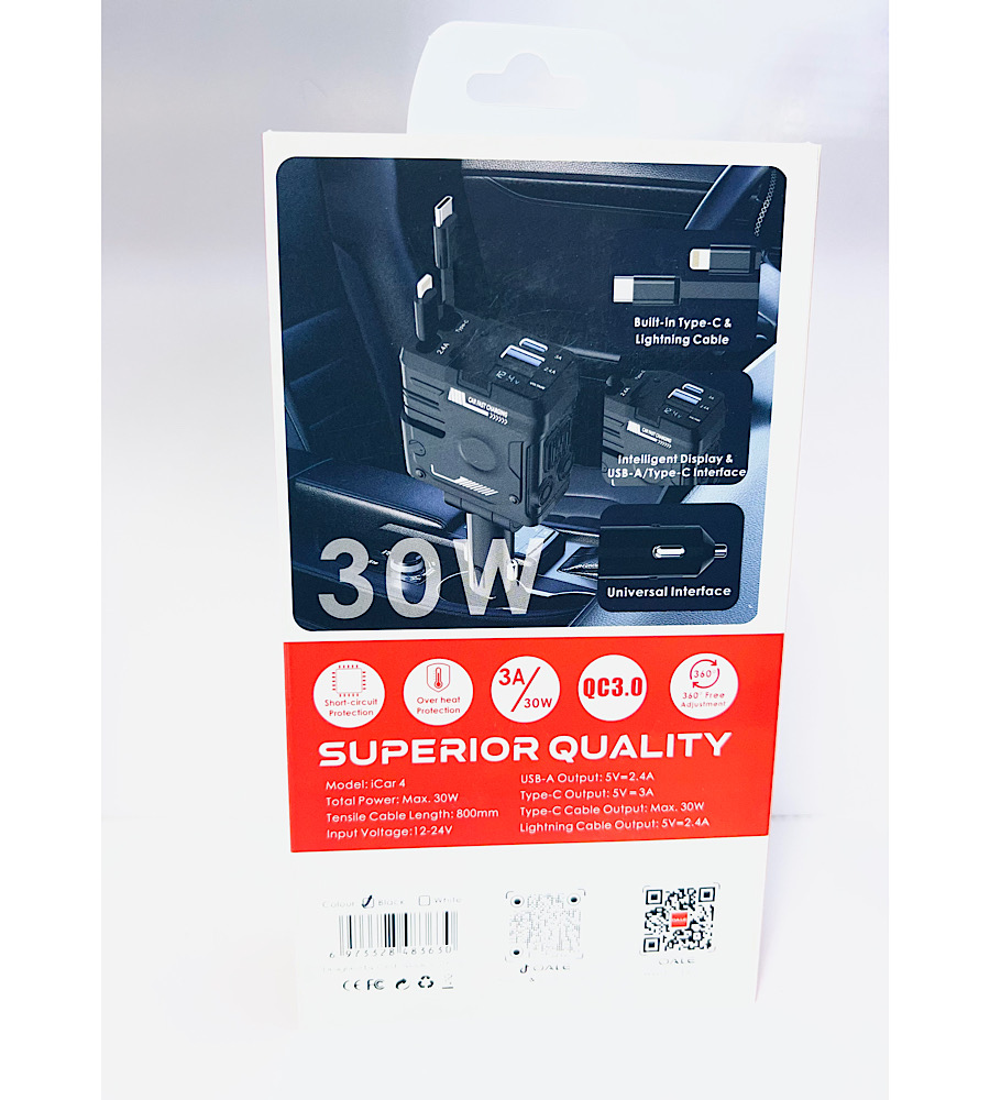 شارژر فندکی ۳۰ وات OALE مدل i car4 باسیمهای جمع شونده