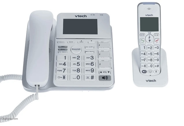 تلفن CRL۵۴۱۰۲ ساخت شرکت Vtech، یک دستگاه با کیفیت و دارای امکاناتی قابل قبول و از نسل جدید تلفن های بی سیم و سیم دار (Two-In-One)، بی سیم و سیم دار است که امکان انتقال تماس، ارتباط داخلی (Intercom) و کنفرانس سه نفره بین گوشی و دستگاه رومیزی برقرار می باشد. صفحه نمایش دستگاه پایه بزرگ و ابعاد LCD آن ۳,۵ اینچ بوده و برای تنظیم در بهترین حالت خواندن، به راحتی شیب صفحه قابل تنظیم است و حداکثر سهولت در استفاده و مشاهده را فراهم می نماید. دکمه های شماره گیر فوق العاده بزرگ بوده و نیز نورانی بودن صفحه کلید باعث می شود در مکان های کم نور و حتی در تاریکی بتوانید به راحتی شماره گیری کنید. گوشی بی سیم نیز در نمایشگر ۱.۸ اینچی خود اطلاعاتی از قبیل میزان شارژ، میزان آنتن دهی، ساعت و تاریخ را نشان می دهد. برای نگهداری شماره های مخاطبین خود می توانید تا ۳۰ شماره را بر روی دستگاه پایه ذخیره کنید که دسترسی به این اطلاعات از طریق دکمه Phone Book میسر خواهد بود. اگر تعداد اقوام و آشنایان شما از این عدد بیشتر است از حافظه گوشی بی سیم کمک گرفته و ۲۰ شماره دیگر را هم در دکمه ای با عکس کتاب ذخیره کنید. یکی از کاربردهای دیگر این دو دفترچه متمایز، برای جدا کردن شماره های کاری و شخصی خواهد بود. سه کلید شماره گیری تک لمسی با امکان جایگذاری عکس، برقراری تماس سریع و آسان را میسر ساخته که این ویژگی برای کودکان و یا افرادی که شماره گیری برای آنان مشکل است، در مواقع اضطراری بسیار کاربردی خواهد بود. بدین ترتیب که بعد از وارد کردن شماره در حافظه، عکس را طبق اندازه مورد نظر برش داده و زیر پوشش پلاستیکی قرار دهید. با قابلیت Caller ID و نمایش شماره تماس گیرنده بر روی دستگاه، از هویت تماس گیرنده آگاه شده و می توانید تماس های ورودی خود را کنترل کنید که شماره ۲۰ تماس آخر بر روی پایه و ۱۰ شماره آخر بر روی بی سیم قابل مشاهده است. برای تنظیم صدای زنگ تماس بر روی گوشی بی سیم از بین ۵ آهنگ و بر روی دستگاه پایه از بین ۱۰ ملودی حق انتخاب دارید. تلفن بی سیم و رومیزی هر دو دارای بلندگوی با کیفیت و امکان مکالمه در حالت Hands Free بوده که در حین مکالمه می توانید به کارهای دیگر خود برسید. میزان بلندی و افزایش وضوح صدا نیز با کمک دکمه تقویت صدا (Booster) و در ۵ سطح قابل تغییر خواهد بود. این قابلیت، صدا را حین مکالمه بهبود بخشیده و واضح تر کرده که موجب سهولت در شنیدن و تشخیص صدای مخاطب می گردد. انرژی مورد نیاز بی سیم توسط یک عدد باتری قابل شارژ تامین می شود که پس از شارژ کامل برای ۸ ساعت مکالمه و یا ۱۰۰ ساعت آماده به کار کافی خواهد بود. در مواقعی که شارژ بی سیم حین مکالمه به اتمام برسد و یا هنگام قطع برق، ادامه تماس از طریق دستگاه پایه امکان پذیر بوده و می توانید به مکالمه خود ادامه دهید.